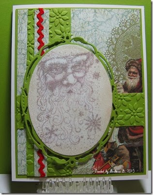 Well no snowflake embossing folder this time, the texture I used is buttons and the white opal liquid pearl on the hats. The sentiment was from the $1 bin at Michaels (they are now $1/50) so you know how long I’ve had it. I love the Merry Christmas script. Patterned paper from a Christmas pad, cardstock is real red and gp white. Stitchy Bear digi outlet is one sponsor for this last challenge of 2013 the other two are Digi Darla Designs and QKR Stampede.