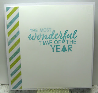 Well slipping in with 1 1/2 hours to spare I finally got my card done for the Jingle Belles Rock challenge to use Stripes and/or Stars on your project. I had this card planned for almost the whole time the challenge was live, it just seemed everything was out to delay me, being retired I should have oodles of time to craft but between June 30 and July 10th I have 6 birthday cards to make along with two Grad cards, that being said I'm happy to get a Holiday card done, so here is my striped non-traditional coloured card.